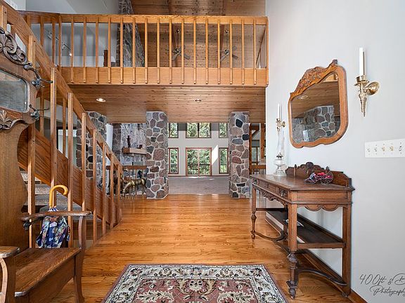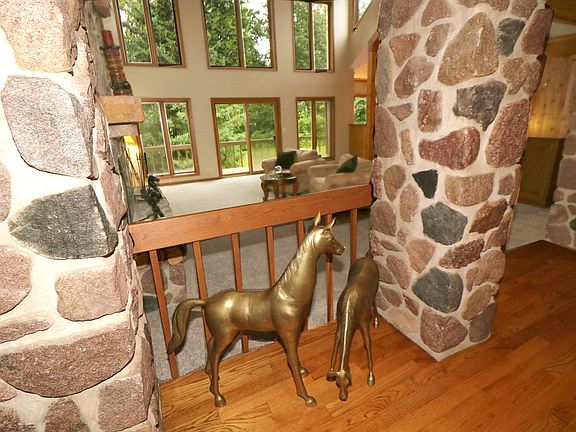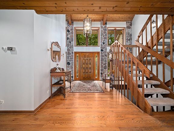 Stunning custom built home on 5.1 secluded acres in the heart of Bull Valley! A vaulted foyer boasts stone columns, a chandelier and open staircase. Pass under the catwalk to the 22' x 22' great room with 29 foot cathedral ceiling and a 2-story wall of windows! The large mantel of the 2-story gas-start, wood-burning fieldstone fireplace was milled from an oak tree felled during construction. An open concept continues post-and-beam style with formal dining on the left with chandelier, recessed lighting, bay window wall and inlaid wood flooring; and on the right is the large kitchen featuring granite countertops, a 3'x5' island with breakfast bar, hickory cabinets with leaded glass and custom etched inserts, and a wet bar section with wine rack. Double French doors enter to the pool room with eating area and gas fireplace overlooking the indoor heated resistance swimming pool. Sliders exit to a two level paver patio and outdoor fire-pit. 2 generous sized bedrooms are also on main floor and one has a stone wall, private balcony and a full bath and tub/shower combination. A 1st floor laundry, a half bath, access to the 3-car garage and access to upper patio with built in grill completes main floor. On the 2nd floor a 10-foot wide catwalk overlooks the foyer on one side and great room on the other and separates one bedroom and large loft at one end from a huge master bedroom with a gas fireplace, skylights, cedar closet and exterior balcony. The en suite bath includes a large dressing area with double sinks, a separate shower, and a whirlpool tub beneath a large skylight. The lower level with above-grade windows has an en suite area with full bath, kitchenette, sitting rooms, closets, a 2nd laundry; a large rec room leading to a bonus room and a full bath servicing the swimming pool which is a half-flight of stairs up. There are 2 utility/furnace areas, one with double door walkout and dog door with outdoor pen. Make this gorgeous one-of-a-kind beauty your very own Home Sweet Home!