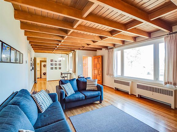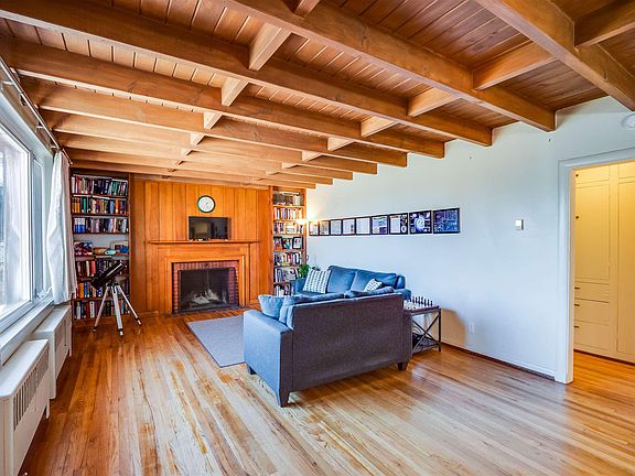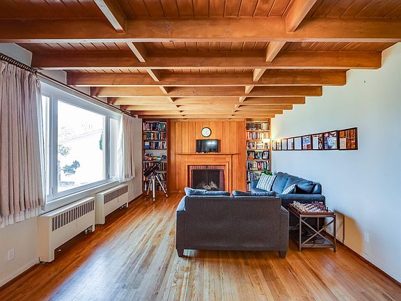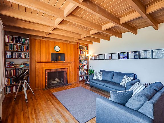 Modest townhouse with huge character. This home's backyard is a gardener's paradise for those with a green thumb. Fully fenced-in with terraced planters, a small patio off the kitchen and shed for all your gardening tools. Right as you walk in, your eye is automatically drawn to the beautiful wood coffered ceilings and large wood burning fireplace flanked by built-in bookcases, not to be outdone by the oversized picture window in this living room. Wood floors run throughout the living, dining, and bedrooms adding to the charm of the home. 2 nicely sized bedrooms with views of the backyard and built-in closet storage. One full bathroom with tiled backsplash and a hallway bursting with floor to ceiling built-in storage. A galley kitchen with great countertop space, tile backsplash and original painted white cabinets with chrome hardware. Gas stove, dish washer, and a place for a stackable washer and dryer. Access to the backyard and to your one car garage that has a loft/workshop above. Come take a look at this sweet little home!