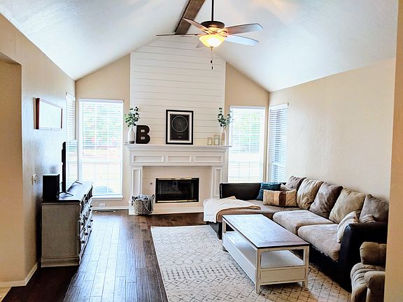 Beautiful renovated home in Edmond's Copperfield subdivision. Hardwood flooring throughout, large fireplace and exposed wooden beam. The adorable kitchen was recently updated with a large center island, granite, painted cabinets and newer stainless steel appliances. The 4 bedrooms are spacious and there are 2.5 bathrooms. Enjoy peaceful evenings on your covered patio with updated landscaping and outbuilding. The 3-car garage has an above ground shelter/safe room. The neighborhood has a park, pool & creek.
