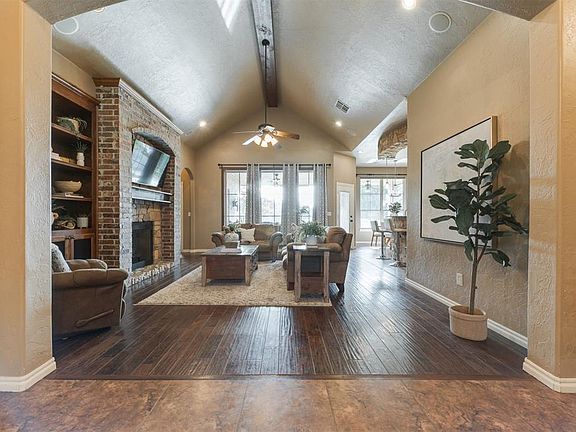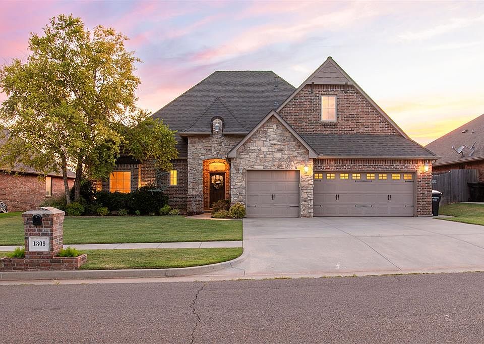 Enjoy the magic of Oklahoma sunsets while relaxing on your back patio. Whether entertaining or spending a quiet evening at home, you will love the amenities your backyard has to offer - basketball court, outdoor kitchen, and water view to name a few! Step inside this charming home and be greeted by an inviting foyer that leads you into the heart of the home. The spacious living room features vaulted ceilings, a grand fireplace, and large picture windows, perfect for those captivating sunsets. With an open concept floorpan, entertaining is a breeze. Your primary suite offers plenty of space to unwind with a large ensuite bath and walk-in closet with built-ins. Home offers two additional bedrooms with a Jack and Jill bath, spacious dedicated study, utility room, mud bench, and half bath all downstairs. Upstairs you will find a large bonus room/flex space with ensuite bath. This space would make a wonderful media room, game room, or additional bedroom! Neighborhood features include stocked fishing ponds, parks, pool, and walking trail. Located on a quiet culdesac, just minutes from I35, this home is conveniently located with shopping, dining, and entertainment nearby. Moore Public Schools. New Carpet and lights, Roof Replaced 2023, Storm shelter located in third car garage. This home presents the perfect blend of modern conveniences and endless opportunity for outdoor enjoyment!