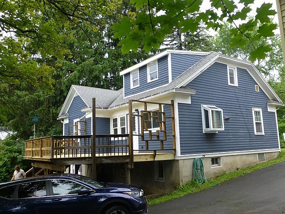 Classic 1930as Belle Sherman Cape with a bright modern kitchen opening to deck with distant views to Ithaca College. A fabulous renovation has just taken place, including an all-new full bath on the 2nd floor. Open living/dining across the front with oak floors, brick fireplace, plus 2 bedrooms and full bath on first floor. Upstairs w/large BR, new bath and study/office. Full walk-out basement and big back yard. Get in here! Open house Saturday 6/22, 12-2.