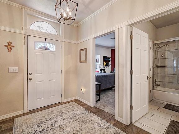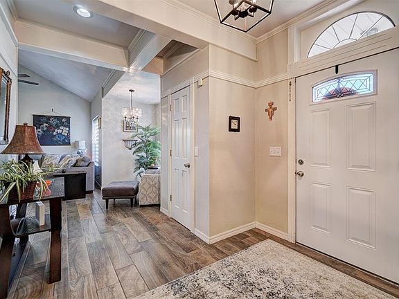 tile. This home has so much storage you’ll be impressed! Many other updates include new HVAC system & window shades in 2024, new electrical panel that includes whole house UPS & roof in 2023, complete remodel, inside & out, 2017-2018, replacement windows in 2017. There is a beautiful sunroom that has French doors that lead out to a deck that includes a cedar gazebo as well as open space and stairs that lead to a fenced back yard. All of this face an HOA association maintained treed common area. The two-car garage boasts walk-up stairs to the floored attic, a wall of metal storage with work space as well as a storm shelter. The full size driveway and garage are accessed through a private drive. Some of the other details to notice are the large stamped concrete front porch, a sprinkler system for the front and back yard, security system. This home has been lovingly renovated, and you’ll be delighted with the results. Don't miss out on this Beauty!