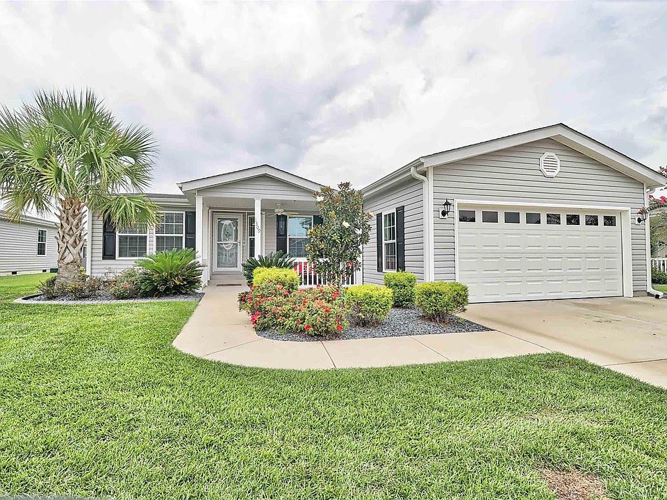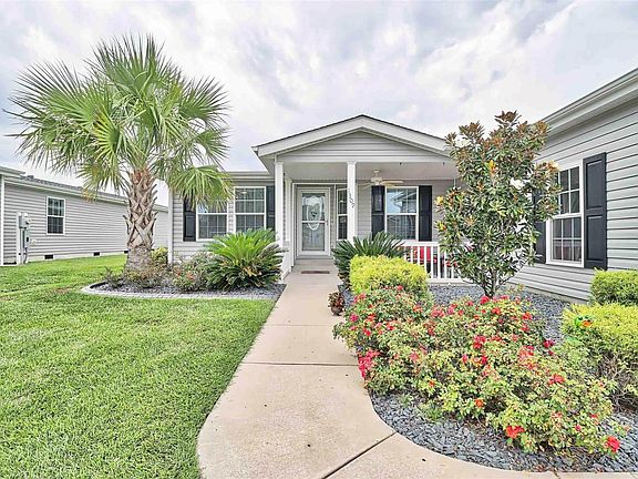 This beautiful Troon model in the 55+ Community of Lakeside Crossing - 2 Bedrooms w/Den & 2 Bath home will wow you! As you walk up the front porch which welcomes you right into the home with a large eat-in-kitchen, new appliances, stove has air fryer feature, 4 door refrigerator, deep stainless steel sink with new faucet, cabinets have been updated with glass panels, there is a large nook and breakfast bar with pendant lights. The open floor plan highlights the amazing views of the lake! As you walk through the views are everywhere - it just flows right into the formal dining room with tray ceiling and into the living room with vaulted ceiling, wall unit w/fireplace, ceiling fan and loads of light & amazing views. The owner suite is large enough for a king size bed, has two walk-in closets & a sitting room, can also be used as home office or home gym - the owner bathroom features double sinks, a large tiled walk-in shower with bench, vanity, and linen closet. A true split bedroom plan, the guest bedrooms are on the other side of the home you will find the guest bedroom, guest bath & Den. The den can be easily transformed into a bedroom; just add doors! The home has wood floors throughout the home with laminate tiles in the baths, updated lighting and plantation shudders in owner's suite, kitchen, den and both baths. (some installed after pictures were taken). There is a 29x12 patio & pergola overlooking the beautiful lake with fountain. The large 2 car garage has an exterior side door, lots of room for storage and access to the rainbird irrigation system. A new "Air Scrubber" has been added to the HVAC system for cleaner air. You don't want to miss this one, it is the largest floor plan with amazing views. It is beautifully landscaped and features curb scapes around the flower beds. This community is in the perfect location close to restaurants, shopping, doctors, hospital, golf courses and of course the beach. Don't forget to visit the amenity center - you won't want to miss all this community has to offer. "It's a Lifestyle"