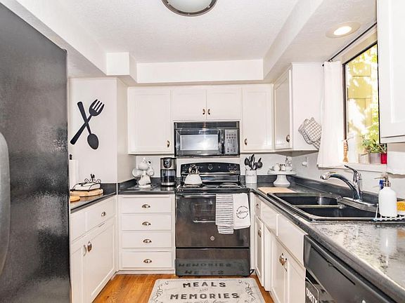 Kitchen has been remodeled with new white cabinets drawers, new black counter top, open concept kitchen with some cabinets removed and a new stove. All appliances are black.