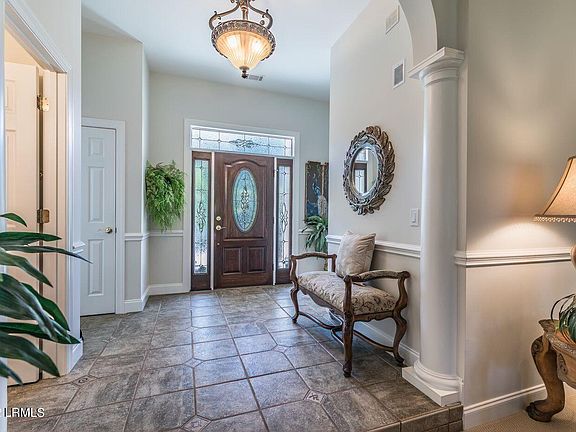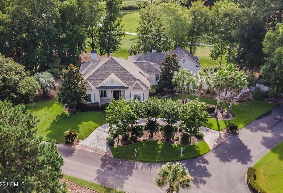 Impressive and spacious, this open floor plan with 3200 sq ft is one level living at its finest. Entering the property, you will find a circular tabby and brick driveway that leads you to the front porch. Once inside you are welcomed into spacious living areas and elegant finishes beginning with a large foyer, custom crown molding, and 10-foot ceilings throughout the first level. The main floor consists of a formal living and dining room, a great room with gas fireplace, large kitchen, screened porch, primary owner's suite, and two guest bedrooms with baths for visiting guests and family. The kitchen is designed for entertaining and features a butler's pantry, gas cooktop, wall ovens, new refrigerator, bar seating and casual dining. Enjoy a gas fireplace and the lake and golf views from