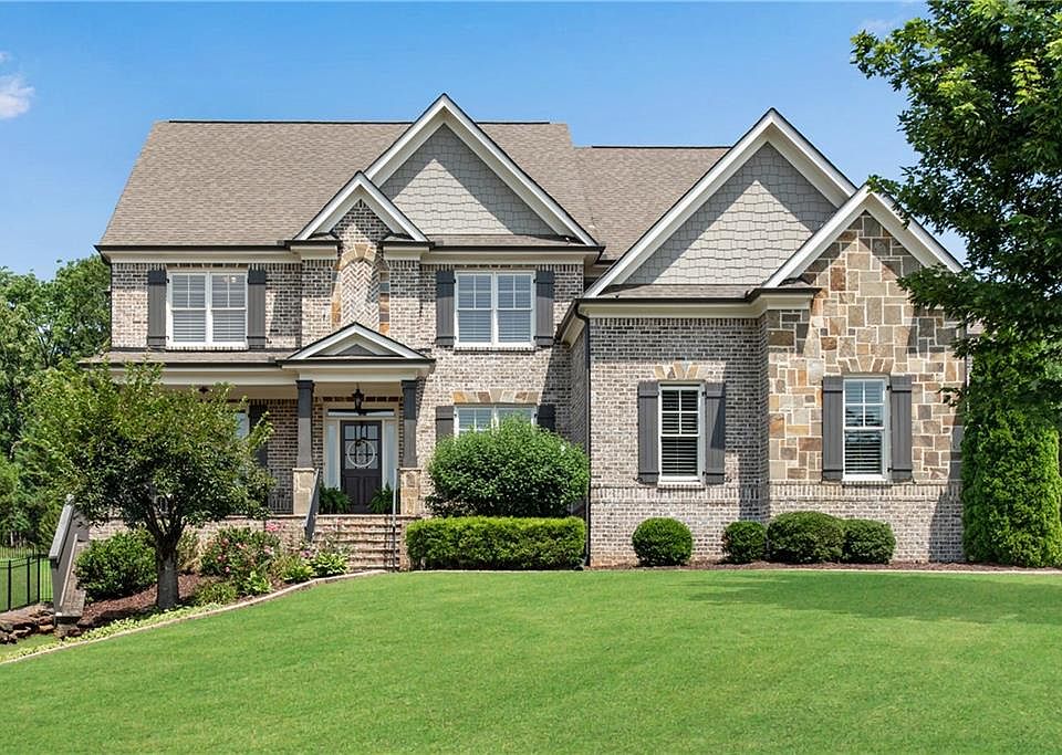 Must see this stunning, well maintained 5 bedrooms, 4 bath brick and stone, custom built home. A superiorly designed home with spectacular views from the covered front porch, covered back porch, or large extended deck with lush mature professional landscaping with sprinkler system and a cul-de-sac, fenced, level, wooded back yard. Hardwood flooring throughout most of the main area, decorated by plantation shutters and iron balusters. The formal living room / office has coffered ceiling and custom oak bookshelf. The spacious formal dining room has a trey ceiling and wainscoting. Open floorplan with natural lighting throughout. Picturesque great room with stone fireplace, built in bookcases, coffered ceilings, and bowed windows. A chef’s dream kitchen with an abundance of custom built-in cabinetry, granite countertops, stainless steel appliances including double ovens, a tile backsplash, and a large center island with beautiful pendant lighting. Large walk-in pantry for storage. Spectacular keeping room with vaulted ceilings with beams, stone fireplace, and natural lighting – great for entertaining. Full bedroom and bathroom on main. Large luxurious master suite on upper level with 2 walk in closets and sitting area. Elegant spa-like retreat master bathroom has jetted tub, large walk-in double shower, double vanities with granite countertops, dome ceiling, and his and her sinks. Upstairs media / exercise room with double doors and bay window. 3 large secondary bedrooms. One secondary bedroom with its own bathroom and two secondary bedrooms that share jack ‘n jill bathroom. Large walk-in laundry room with a mud sink. Grilling deck for the barbecue. Full unfinished daylight basement. Recently painted exterior and new hot heater. Convenient access to Mulberry Park, Chateau Elan, restaurants, and Mall of Georgia.