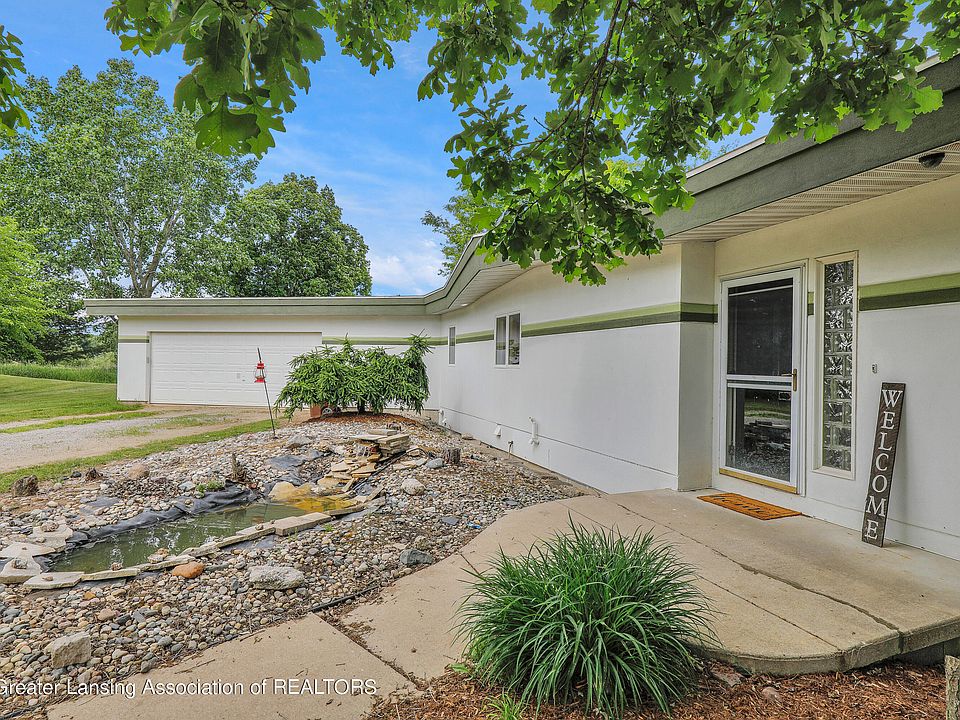 Grand Ledge/Wacousta Elementary : Ranch style home on almost 5 acres with a barn and a pole barn. Home boasts 4 bedrooms and 3 full bathrooms. The views are INCREDIBLE!!! Current owners love sitting on the 700 sq' ft' deck for total relaxation time. This home is NOT a drive by. You must get IN the home to appreciate all it has to offer. This Modern style home with large open floor plan offers tons of space to spread out for all of your activities. Primary ensuite bedroom offers great closet storage and views. First floor laundry! The bladder for the well is less than 2 years old and home features a new hot water heater and new iron filter. Home is a walk out and all lower-level doors have all been replaced.