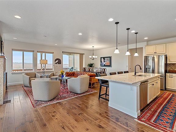 Back on the Market! Situated atop the highest point on a premium lot in the Skyestone 55+ Community, this outstanding Taylor Morrison home has unsurpassed views of the Flat Irons and Longs Peak. The Great Room and kitchen offer an expansive gathering space that leads out onto the extended covered deck to enjoy an early morning breakfast or wind down at the end of the day enjoying dinner and sunset views. The chef's kitchen includes upgraded soft close cabinets, pullout drawers, Snow Leopard quartz on the island, Mahogany quartz on the perimeter, and designer chevron tile on the backsplash. The gourmet appliance package along with upgraded lighting faucet and hardware creates a haven for any cook. A contemporary rectangular fireplace with stacked and split-faced stone creates a warm and welcoming living space. The Owner's Suite features mountain views, a beautifully appointed bathroom with Kohler double vanities, quartz counters, upgraded cabinets, tile, and a custom walk-in closet with ample storage and hanging space. The Guest Suite has been thoughtfully located at the front of the house, complete with en-suite and walk-in closet. A large study that could also be converted into a third bedroom is situated quietly away from the living area. A half bathroom with designer floor tile, laundry room with utility sink, ample storage, and a generous mudroom with seating area round out this beautiful home. Additional highlights include Mohawk Horseshoe Hickory wide plank wood flooring, upgraded baseboard and crown molding, open wood railing, plantation shutters, Hunter Douglas blinds, professionally landscaped yard, raised flower bed and finished 2 car garage. An unfinished walkout basement is ready to be customized for additional living and entertaining needs. Skyestone Community features a gorgeous clubhouse, pool, pickleball courts, gym, and a full-time activities director, miles of hiking and biking trails, and proximity to Flatiron Shopping Center and Boulder.