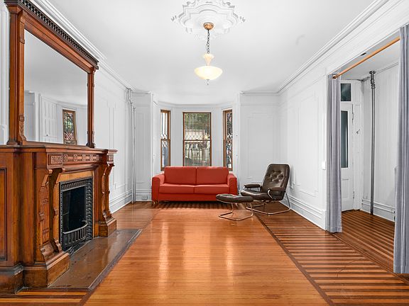 This sun-filled floor-through residence is approximatey 1600 SqFt and enjoys southern exposure, bathing the interiors in natural light throughout the day. A private entrance beneath the townhouse stoop leads into a generous living room rich with original details, including an ornate decorative fireplace, hardwood floors, soaring ceilings with medallions and plaster moldings.