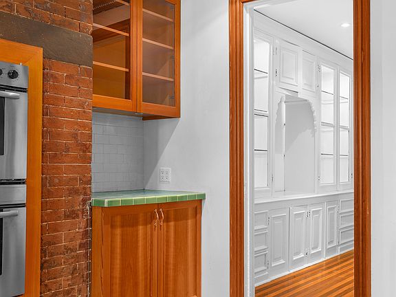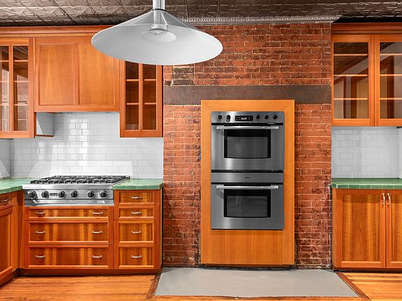 A hallway with illuminated built-ins and a laundry closet with washer/dryer leads to the eat-in kitchen. Here, classic design meets modern convenience with green-tiled counters, a tin ceiling, premium appliances, and access to the serene backyard via a mudroom.