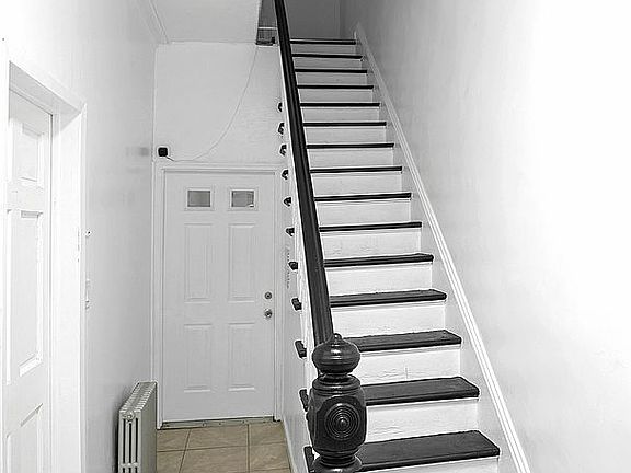 Exterior: Situated on a two way street, this three-story townhouse boasts an attractive vinyl-siding that is newly painted. The property shows a well maintained entrance that welcomes you into the first floor lobby. The exterior of the home exhibits a new era of renovation, with its grey vinyl-sided coloring and dark colored borders. Exceptionally, the roof of the property was also redone in 2021.