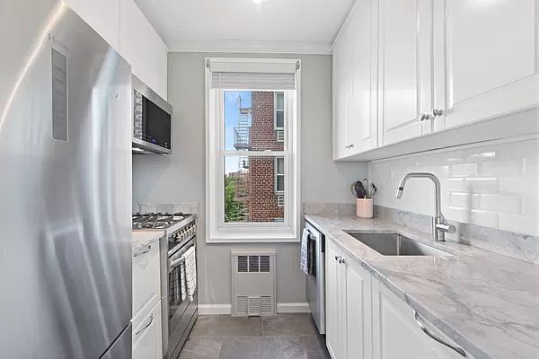 Welcome home to this wonderful, renovated, large studio apartment in the heart of Bay Ridge. This extremely bright, high floor, North-West facing unit features four large closets including one walk in, providing more than enough storage space. The over sized windows face Manhattan and offer a beautiful open view. There is a separate, meticulously renovated kitchen, lined with white cabinetry, Quartz countertops, and professional grade stainless steal appliances including a dishwasher for your connivence. The bathroom is renovated and neatly placed just outside the living area giving the apartment a much larger feel. 131 74th street is a cat friendly, elevator building which includes a live-in super, laundry room, renovated lobby, storage units(waitlist), bike storage, garage (waitlist), and common outdoor space. Subletting is allowed after two years. The maintenance includes heat, hot water, and cooking gas and the building is fios ready.