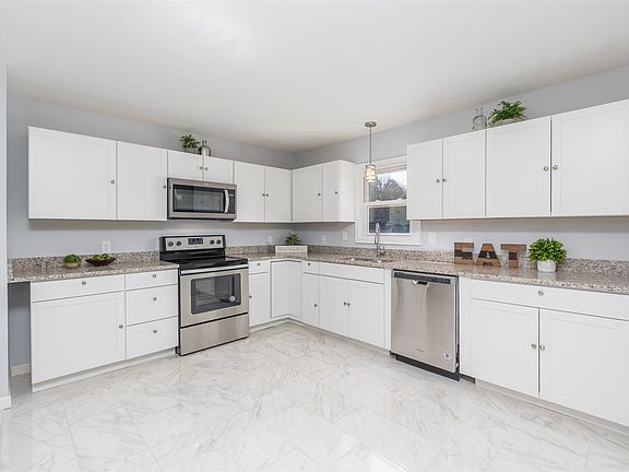 Move-in ready remodel! All you need on one level. Living room with hardwood floors and charming bay window. Brand new kitchen with porcelain tile, granite counter-tops, white cabinetry and stainless steel appliances all open to the dining room area. Master bedroom features a walk-in closet, and full bath. French doors opens to the huge rear deck adding outdoor entertainment space that is surrounded by a fully fenced and spacious backyard. The attached two car garage is conveniently located off the kitchen/dining area and adds additional storage. Plenty of room outdoors with over .6 an acre. Additional storage in the conveying storage building. City conveniences with a county location. Home warranty offered!