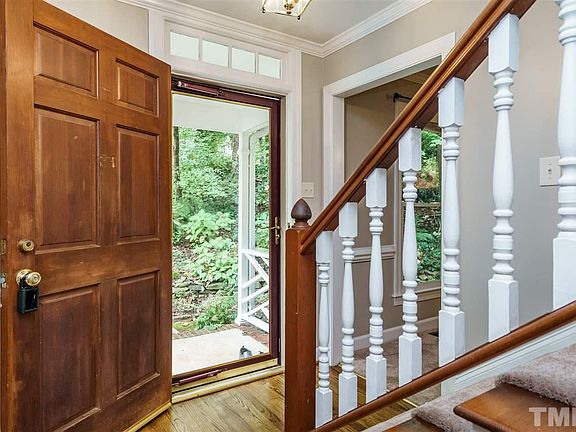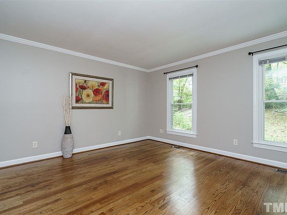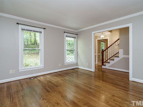 Cary classic on greenway lot!! Walk to parks, school & Trader Joe's! Updated eat-in kitchen w/ granite counters, laminate floor, island & pantry. Owner's suite plus second bedroom main floor; Two large bedrooms plus office space upstairs. Updated owner's bathroom w/ granite counter. New vinyl windows! Fabulous flexible basement with outside entrance, vinyl floor, heater & power circuit; Perfect for shop or playroom. Mostly new interior paint. Huge garage. Lovely landscaping and wooded view.