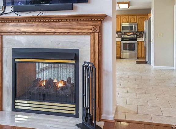 Much sought after 1.5 story home located in upscale lake community with easy access to I-44. The spacious living room features a wall of windows that allows natural light to fill this luxury home. Cozy see-through gas log fireplace compliments the roomy breakfast nook with bay window and deluxe kitchen with newer stainless steel appliances. Hardwood and ceramic flooring throughout the main living areas including the main floor master suite. Master bath has separate jetted tub & shower and dual bowl vanity. Main floor laundry. Upper level hosts loft area, guest bath, and 2 nice sized bedrooms...one with cathedral ceiling. The lower level is finished adding a recreation area, game room, 1/2 bath, & family room/sleeping area, plus a storage room. Everything is neat as a pin. The front view takes in the lake & the rear yard backs to an open field and trees. Private 24 x 14 patio to enjoy occasional deer. Oversized 23 x 20 attached 2 car garage PLUS BONUS 24 x 24 detached 2 car garage.