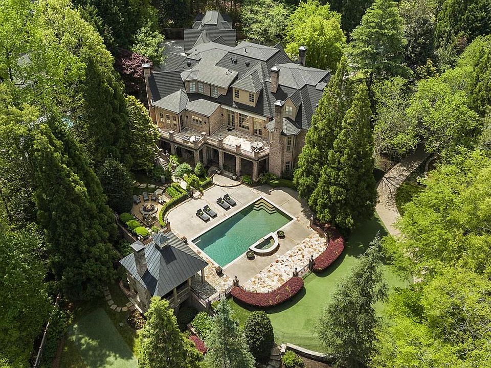 A gated estate with stunning landscaping located in a private setting, this Harrison Design home welcomes you with grand french doors that open to the two story foyer. Through the foyer you will find the fireside formal living room that is full of natural light from the floor to ceiling windows, adorned with coffered ceilings, built-in bookcases and two sets of french doors that lead to the patio. The chef's kitchen features wood beams, built-in fridge and freezer, three ovens, gas range, custom cabinets, two islands. The kitchen overlooks the keeping room that features custom stack stone fireplace, custom built-in bookcases and a vaulted ceiling. The spacious formal dining room can accommodate a large number of guests for entertaining. The openness of the kitchen and keeping room are designed to provide seamless access to the back patio, making it easy for you to enjoy the outdoors while cooking and entertaining. The primary suite located on the main floor features a fireside sitting area, which has private access to the back patio.The primary spa-like bath is equipped with a double-sided steam shower, a soaking tub, and two large vanities. The closet is a dream come true for any shopping enthusiast, featuring custom built-ins and an island in the middle. The main level also features a mud room and two offices. On the second level you'll find four guest suites, all equipped with their own private baths and great closets. There is also a media room with theater seating and kitchenette. As you move down the hallway past the bedrooms, you will come upon a stunning hand-painted mural that stretches along the walls leading to the playroom, in this hall, you will discover a hidden reading nook. The playroom is a paradise for all ages featuring a built-in stage and curtain, ample space to accommodate anything your heart desires. Every detail has been meticulously thought out in this room, ensuring a playful and whimsical atmosphere. The terrace level is a perfect place for those who love to entertain guests. The living room area is designed to provide a fabulous view of the pool. There is a full kitchen, featuring custom cabinets and high-end appliances. A well-designed dining area perfectly complements the kitchen area. Beyond the kitchen is the home theatre/golf simulator featuring a projector screen that disappears when not in use. On the opposite end of the terrace level is a wood paneled billiard room featuring a cozy fireplace sitting area, built-in bar with refrigeration and sink. Additionally there is a fantastic workout room, a sauna, and an additional guest suite. Whether you're enjoying the upper patio or the cover deck you witness the stunning views of the property. The pool and spa are the focal point of the outdoor space. The open air pool house features a brick fireplace, tongue and groove vaulted ceilings and stone decking. The cozy fire pit sitting area tucked away near the pool makes you feel immersed in the great outdoors. This home also features a putting green, wonderful play space and turfed area perfect for batting cages or additional play space. The picturesque paved stone path that leads you to the guest house, you're welcomed to an charming open interior featuring a cozy living room, full kitchen, dining space, a guest suite with a full bath. There is also a three car garage on the lower level of the guest house. This remarkable home has everything you need and more, conveniently located near all that Atlanta and Sandy Springs has to offer.
