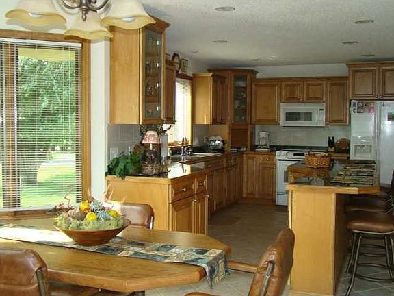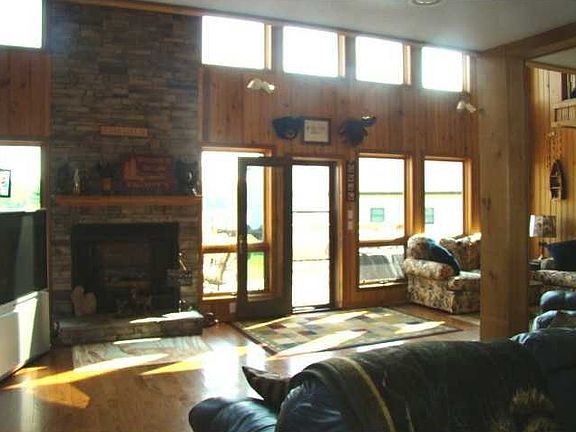 Beautiful home with 60' lakefrontage & fantastic lakeviews from dock area; great room with soaring ceiling, stone fireplace, cedar walls, hardwood floor, wall of glass opening to deck. Kitchen with 10' island, marble top, maple cabinets, ceramic floor,; master ensuite with fireplace, walk in closet. Great floor plan, pristine condition with complete new vinyl siding 2 yrs. ago. Synthetic decking at lake with floating docks; golf cart included
