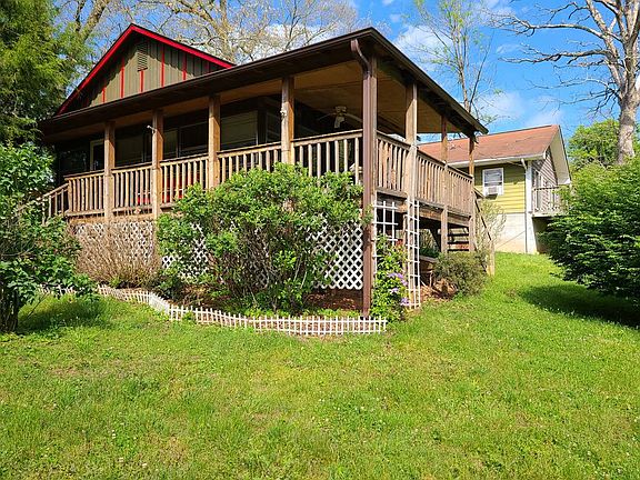 Cute cozy Cabin that has been lovingly taken care of over the years. Makes a great vacation or full-time home sitting on an almost flat 1/2 acre lot that is all usable land and has no restrictions, and has room for a big garden, chickens or you can fence it in for pets. Has privacy & beautiful mountain views from the large wrap-around porch. The cabin comes almost completely furnished & has 1 bedroom, 1 bath with a large open living/dining room combination, that is warm and cozy with its wood walls, ceilings, and floors & Rock FP. Has an updated kitchen with newer cabinets and countertops. Also has a large sunroom that could be used as additional sleeping quarters. There is a detached 38 x 25 garage that has the additional 2 bedrooms and bath in it, with its own deck that has wonderful mountain views. The garage has been already wired and plumbed to be easily finished into a kitchen (comes with an additional ref. and gas stove) and living room and make it another cabin, that you can rent out. The main home also has an attached 1 car carport. There is CH&A too. This is a peaceful mountain retreat yet not far from town. This affordable move-in-ready home could be yours.