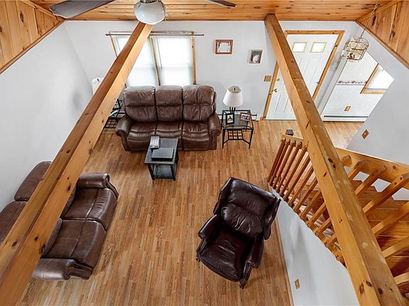 This is not your typical Saltbox Colonial! Upon Entry the First Thing you Notice is the Dramatic Cathedral Ceiling Wrapped in a Distinctive ShipLap Wood which Flows Beautifully to the Open Staircase and Second Floor Landing. The Main Floor has an Open Concept with Hardwood Floors throughout the Living Room, Dining Room and Den or Bonus Bedroom. The Kitchen is Spacious w/lots of Counter Space and Cabinets and Ceramic Tile Flooring. Off the Kitchen is a Full Bath and Sliders to the Large Two-Tiered Rear Deck and BackYard. Parquet Wood Floors flow from the 2nd Floor Landing into the Master Bedroom. Adjoined is the Master Bath w/Whirlpool Tub. Completing this Floor are Two Additional Bedrooms. The home has Gas Heat, New Roof, Vinyl Windows and a Deep Garage. Close to all amenities w/easy access to Shopping and the Highway.