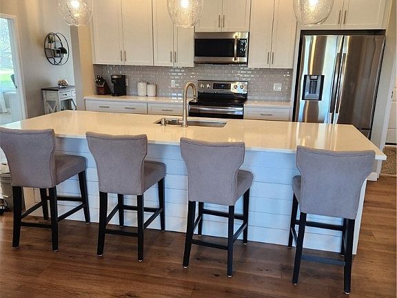 This newer walk-out ranch provides a spacious 3 bedroom 2 bath floor plan with a large yard and a view of Lake Red Rock from your covered deck! Some of the many features include a walk-in pantry, large island in the kitchen with quartz counters. Large finished lower-level family room and tuck under garage for yard equipment. The primary bedroom has an ensuite bathroom with tile shower adjacent to your walk-in closet with access to the laundry area. 3 car garage with 8' tall doors for your truck or SUV. More outdoor space with the 12x23 paver patio with hot tub included. Easy access to the Volksweg trail, boat ramp and marina.