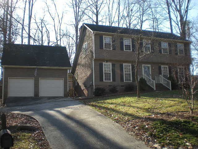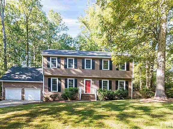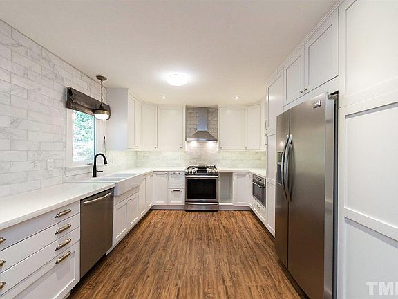 This Wake Forest two-story offers quartz kitchen countertops, stainless steel appliances, a fireplace, a deck, and a two-car garage.