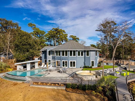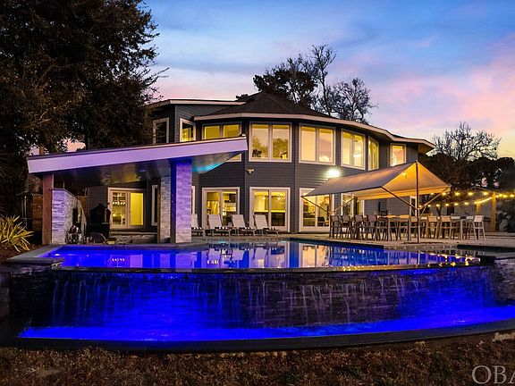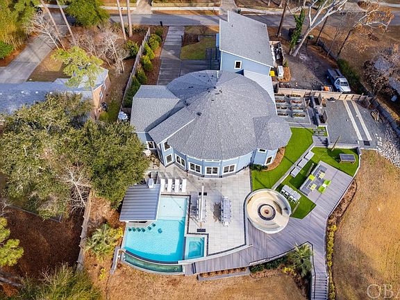 No Reserve Auction will be held on-site on Monday, March 18, at 11:00 AM. Starting Saturday, March 2, previews every Saturday & Sunday 1:00 PM-4:00 PM; private appointments are available; call for details. Sprawled across a huge, elevated lot in the coveted Southern Shores community, this Deltec-constructed home is quite simply, jaw-dropping. The Outer Banks has nothing comparable to this exquisite living and entertaining state-of-the-art estate. It’s truly a one-of-a-kind marvel. Specialized construction combine with energy-efficient, durable products that are not only hurricane resistant, but also maximize the unique geographic landscape. The cylindrical two-story design is perfectly suited to indulge panoramic water views throughout the home for the ultimate indoor-outdoor experience. This resort-style inspired property boasts over 6,000 sqft of exquisitely designed interior with 4 bedrooms, 2 full bath, 2 half baths in the main house, custom two-car garage with half bath, a fully equipped apartment with full bath and private bedroom, separate office building with personalized deck space and private half bath, and massive outdoor entertaining area complete with infinity-edge pool, firepit, dining areas, swim up bar, and outdoor kitchen. The property is, as it states, one-of-a-kind. No feature list could truly give justice to the amount of detail present in this captivating home. Here are just a few: Custom Blue Star Range and Hood, 6-burner Wolf, in-counter Wolf Fryer and Steamer, Savaria Glass Elevator, 400-gallon salt-water aquarium, custom-made staircase by Keuka Studios Metal works with Canadian Glass custom treads, stadium seating movie theatre, whole house generator, safe room, security system and boat dock with 15,000 lbs lift. Full Detail and Features Available via Associated Docs. Schedule your private tour of this custom home and revel in the unique opportunity to own one of the most impressive properties on the Outer Banks.