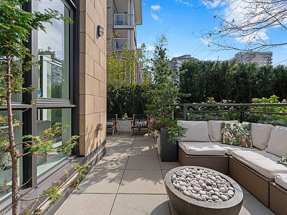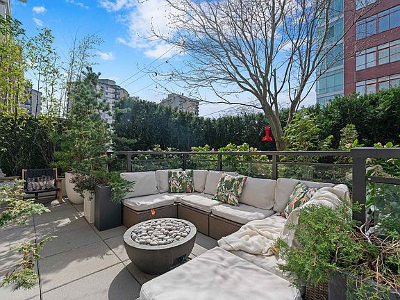 Welcome to the epitome of modern living in Lower Lonsdale! This impeccably designed one bedroom and den condo is an entertainer's dream with an open concept layout that showcases stunning 12ft ceilings and spans 770SF of exquisite interior living space. Extensively updated gourmet kitchen, complete with granite counter tops, professionally designed kitchen island, custom cabinets, hardwood flooring, custom wall panelling throughout and A/C installed with Heat Pump. As an extension of the indoor living space, step onto your terrace of dreams and experience a sun drenched oasis of relaxation surrounded by greenery in complete privacy. Just a short walk to the vibrant Shipyards, Lonsdale Quay and the seawall. Don't miss the chance to make this your own this hidden gem in Lower Lonsdale!