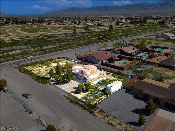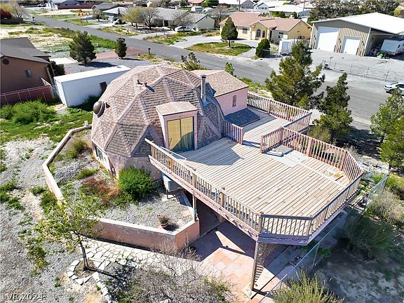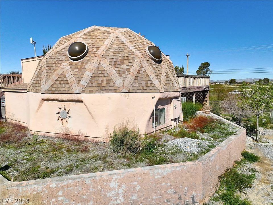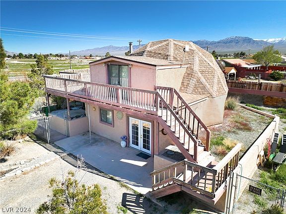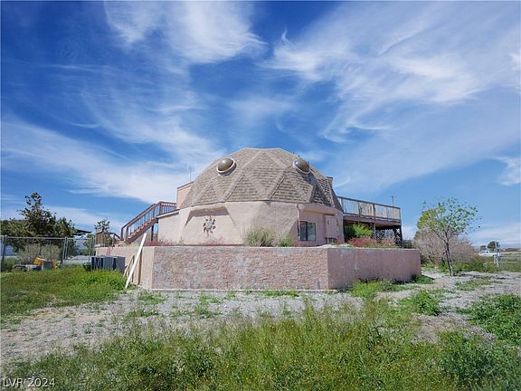 Discover this one-of-a-kind Geodesic dome home in Pahrump, NV, featuring 2 bedrooms and 2 bathrooms across 1,274 sq ft of living space. Situated on a generous corner lot under a half-acre, this property offers stunning mountain views from the upstairs balcony deck, directly accessible from the over-sized primary bedroom. The primary suite, located upstairs, is enhanced by the cozy warmth of a wood-burning stove. The property includes a partially fenced backyard, mature trees in the front yard, and a storage container for additional utility. While it requires some TLC, this home holds tremendous potential for the new homeowner or as an attractive rental property. Home is being SOLD AS IS, WHERE IS, no repairs will be made on this home. CASH or Renovation loan accepted.