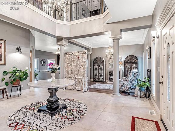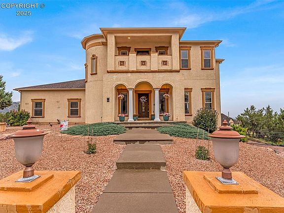 Perched to capture breathtaking views, this nearly 5,000 sq. ft. estate is more than a home—it’s a statement of timeless elegance and refined living. Inspired by classic Tuscan architecture yet enhanced with contemporary touches, every detail of this 5 bedroom, 4 bathroom home has been thoughtfully curated to inspire and impress. Step into the grand foyer, where a circular staircase with custom wrought-iron detail rises dramatically beneath soaring 20-foot ceilings. The heart of the home is the gourmet chef’s kitchen, complete with handcrafted cabinetry, stainless steel appliances, and a gorgeous center island, ideal for both cooking and entertaining. A formal dining room flows seamlessly into a wine room/wet bar, creating the ultimate space for hosting gatherings. The elegant living room with a fireplace opens onto a spacious deck, where sweeping views provide an unforgettable backdrop.Upstairs, the primary suite is a private retreat, featuring a luxurious five-piece spa-inspired bathroom, a custom walk-in closet, and a private balcony. Two additional bedrooms and a full bathroom complete the upper level.