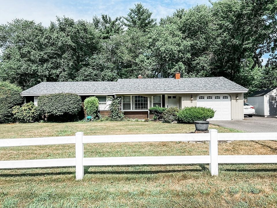 Welcome to Pleasantfield! Looking for a one-level living with room to spread out? This comfy ranch offers a granite kitchen, ceramic & porcelain tile flooring, hardwood floors in the living and dining room, and an "Oh yes you'll want to snuggle up to me" fireplace. Full Bath with Walk-In Shower, glass doors, and Primary suite with 1/2 bath. Large level backyard for those get-togethers or just a spot to escape around the outdoor fire pit. Other updates include Roof, boiler, siding, 2 sheds & white fencing. Conveniently located to schools, shopping & highway. "some photos are staged".