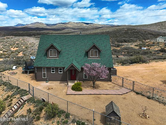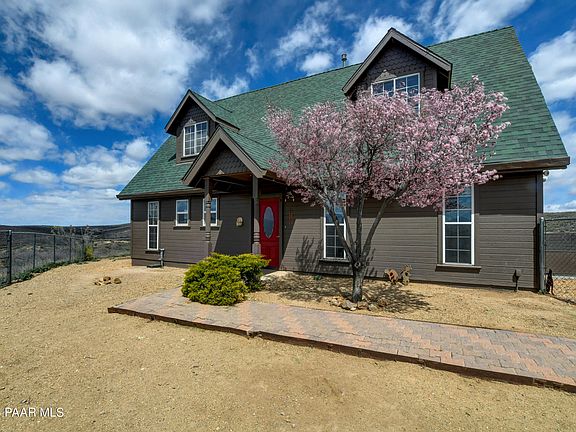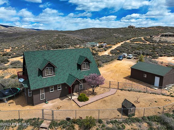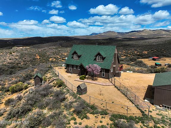 This hill top property sits on 7+ acres, overlooking BLM land. The cute A-frame house has been lightly updated emanating a cozy country feel. The base level includes a rustic kitchen, living rm, large bathroom & large laundry rm. Imagine spending the summer BBQing on your entertainment deck, taking in the 360* views above your paddock to the surrounding Mtns; a better future of sunrises & sunsets. Two bedrooms upstairs include a large master suite w/ ensuite bathroom ready to make your own, & cute ''Juliet'' style master balcony. BONUSES include: large detached 2 car garage, fenced front yard, 2 HIGH PRODUCING WELLS, large livestock paddock w stalls, tack rm & shed. Living here, you'll be riding the BLM trails over the Bradshaw's to Jerome and beyond. Lots of recent updates!