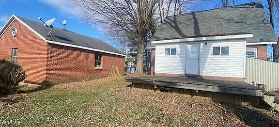 1 1/2 story brick home in city limits of Bedford, Newly updated kitchen. Fenced in yard. Washer/dryer hookups on first floor and also in basement. Covered sitting area in back yard. 1 BR 1BA on first floor, 2 BR 1 BA upstairs. Lots of closet and storage space upstairs and also storage in unfinished basement. Make your appointment to see this home!