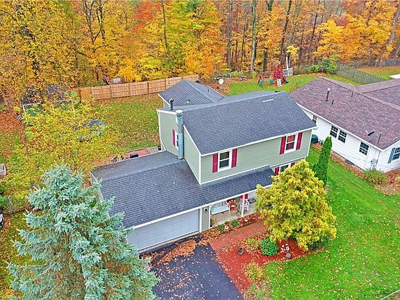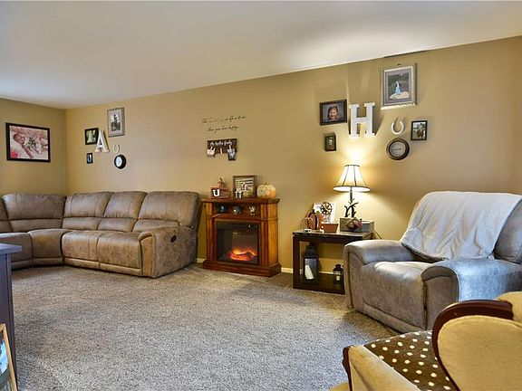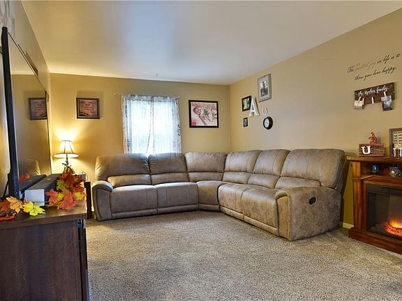 Find that perfect blend of comfort and style as this two-story Cortland residence makes it easy to call it home! Standing proudly with its captivating green paint, trimmed in white and accented by red shudders, the tastefully landscaped home easily draws you inside past its covered front patio. A tiled foyer presents a carpeted staircase leading to the bedrooms, while the inviting living room beckons you near with its lush carpets and glowing fireplace. Opposite, tile work extends into the corner family room before finding the two-car garage and half bath. The central kitchen wows with its charming brick work and unique wrapping layout that ends with a scenic dining area, bathed in sunlight from the tall picture windows. Upstairs, the three bedrooms branch off with bold colorways and carpeted flooring. A fourth bonus room offers built in storage for a common walk in closet or easy home office. The master bedroom contains its own full private bath, meanwhile an additional full bath resides at the landing with its oversized layout. Additional features include a partially finished basement with woodburning fireplace and a sizeable rear patio with matching shed/worshshop. Many updates including New blacktop driveway in 2020, basement windows, ext doors and fence in 2019, Carpeting in LR and steps in 2018, New siding in 2016, New furance and AC, some new windows in 2015. Get in to see it before its gone! Lakeview Schools. Cinch Home Warranty included!