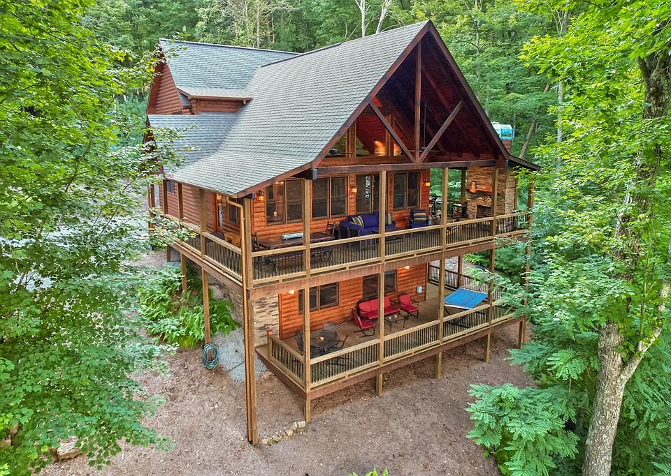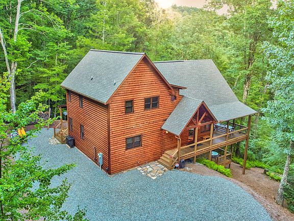 NEW PRICE and well below appraised value! This stunning, furnished mountain home perfectly blends comfort and natural beauty. Located in a private gated community, the property sits on 2.87 wooded acres and features 3 bedrooms and 3.5 bathrooms. Key features include 3 stacked stone fireplaces, an open floor plan with stunning granite counters and ample cabinetry in the kitchen. With a primary suite on the main floor plus an additional en-suite and sleeping space upstairs, this home is perfect for family and friends or as an investment property. The terrace level includes another guest bedroom, bathroom, and an exceptional entertainment area with a wet bar and wine cooler. The home is equipped with a tankless water heater and dual-zone HVAC for optimal comfort and is wired for a hot tub on the terrace level. With over half an acre of level terrain, the kids and pets can enjoy many activities safely. Conveniently located just minutes from downtown Blue Ridge, this residence provides easy access to a variety of restaurants, shops, wineries, and outdoor activities, including horseback riding and hiking trails. Stanley Creek, Falls Branch, and the Toccoa River are just a short distance away and offer trout fishing, kayaking, tubing or just relaxing while taking in the beautiful views. It perfectly combines natural beauty with convenience, making it an ideal serene mountain getaway.