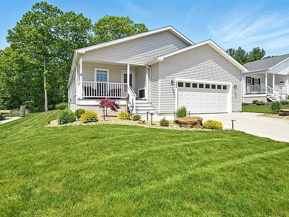 This stunning modular home, built in 2022, stands out with custom blinds and an inviting 10x20’ sunroom with a ventless gas fireplace for cozy nights. Enjoy walking out the back of your primary bedroom onto your back deck made of Trex and overlooking the wooded area. The home offers three bedrooms, with one currently used as an office featuring elegant glass doors. The heated two-car garage includes attic storage and built-in shelves for organization. Additional upgrades include a water filtration system, gutter guards and a welcoming front covered porch, perfect for relaxing. Nestled in a desirable 55+ community, this home seamlessly blends modern features with thoughtful details for easy, comfortable living. Do not wait on this one. It is truly one of a kind!