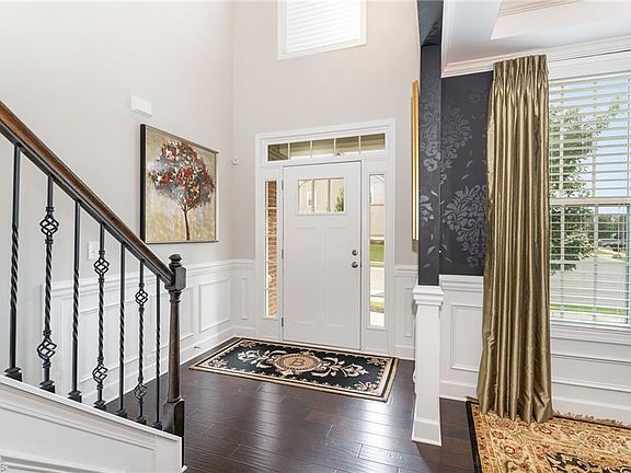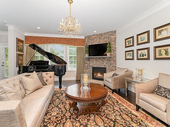 Immaculate home with elegant features throughout! This property boasts an open kitchen and living area centered around a stone fireplace with gas logs. The two-story entry and dining area highlight beautiful wainscoting, while the main level features 9-foot ceilings, heavy crown molding, and engineered wood floors. The kitchen is a chef’s dream with granite countertops, a gas cooktop, double ovens, a built-in microwave, and a pantry. Enjoy a formal dining room with a coffered ceiling and a secondary bedroom and full bath on the main level. Upstairs, find four bedrooms, including a primary suite with a tray ceiling, separate shower, garden tub, double vanity, and large walk-in closet. Additional highlights include a built-in drop zone, 2-inch blinds, a covered porch, and an uncovered patio. The well-maintained lawn has a sprinkler system, and the property backs up to trees. The community offers a pool and clubhouse and is conveniently located near highways, dining, and a hospital.