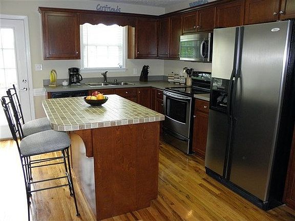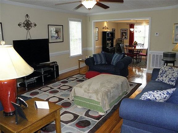 Gleaming hardwood floors throughout main level with slate in guest bath room. Open living room and dining room lead in to the large spacious kitchen. Crown moldings and chair railings add that finishing touch. Owner's suite with vaulted ceiling and large luxurious bath. Secondary bedrooms are well sized with great closet space. Lower level garage and storage. Very nice neighborhood.