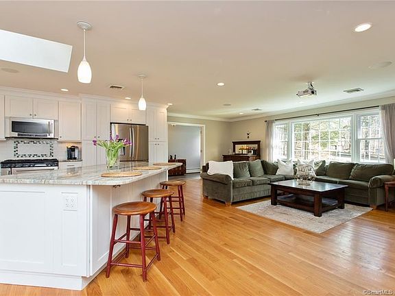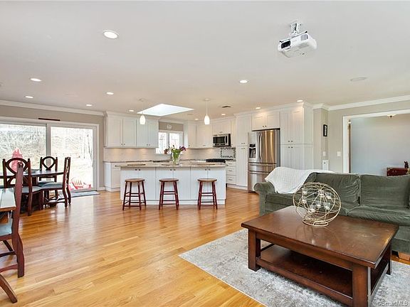Immaculate, updated, spacious, and bright ranch with an open floor plan. Gracious foyer with french doors to the Living room with a big picture window & fireplace open to the dining room and beautifully updated kitchen with granite counters, a big island, skylight and stainless steel appliances. There is a family room with skylights and sliders to the enclosed porch. The laundry room with a window seat is nice and bright. Fresh painted throughout. Lovely master bedroom with a great bath, new shower with frameless glass doors, a great retro sink and a whirlpool with a big window. There are 3 other bedrooms and a fully updated bath with jet tub. The 2 car garage with a back staircase to the attic and bonus room in-law/aupair/office is tucked away and complete this wonderful home with a lovely level property and a spring fed pond on the side. This immaculate, open floor plan ranch is bright, spacious and has been updated throughout. The entertainers kitchen is perfect for large families and gatherings; the kitchen and living area have been completely renovated with granite countertops and a large island great for groups and all stainless appliances. Skylights, two eight foot sliders; one to the patio area and the other to a large screen porch plus a large picture window make this house dazzle. A family/TV room is also sunlit with two large skylights and great views to the extensive backyard. Incorporated in the entertainers kitchen is an eat-in kitchen and a large Living area as well with working wood fireplace. All three bathrooms have been updated as well as the foyer with french doors to the living area. Privacy is abounding for this four bedroom plus a potential in-law/au pair/office. The master bedroom has a spacious master bath with new glass shower and whirlpool soaking tub set under a large window. It is finished by designer sink cabinet and iron light fixtures. Stay warm in both bathrooms with in bathroom heat made especially for cozy showers. Center hallway is illuminated by two sun tube skylights which flood the area with light. Three bedrooms finish the first floor with well apportioned sized rooms. The 2 car garage with stairs to the potential in-law/au pair/office space and walk up attic which spans the whole house for storage. Set on bucolic two acre, level lot in North Stamford but close to lots of amenities in a short 5 min drive, or walk to the Stamford Museum and Nature Center and Northeast Elementary School. Nature is everywhere, turtle cove, several species of ducks, mink, herons and many types of frogs will keep you wonderfully entertained all four seasons on the professionally landscaped yard. Bonus large cedar shed 12x16 for all of your yard needs. Call (844) 385-5344, Extension 109, to listen to an audio recording about this home.