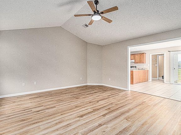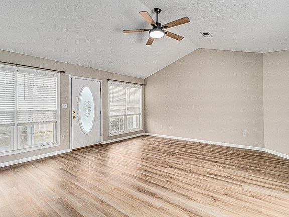 This charming three-bedroom, two-bathroom home is located in a desirable neighborhood known for its excellent schools. Situated on a cul-de-sac, this home boasts a welcoming front porch that is perfect for relaxing. Upon entering the home, you'll notice the updated luxury vinyl plank flooring in the living room and the vaulted ceilings, which give the room a spacious and airy feel. The living room is perfect for entertaining guests or relaxing with the family. The fresh paint on the walls and updated lighting fixtures add to this home. The bedrooms have been updated with new carpet, giving the space a cozy and comfortable feel. The primary suite is impressive, with two linen closets, double vanities, and a spacious walk-in closet. The garage has been converted into a versatile space that can be used for storage, a home gym, or a playroom. The garage can also be easily converted back into a functional garage if needed. This additional space makes the home even more appealing and flexible. This home has also received several recent updates, including a new roof and a water heater, ensuring that it is move-in ready and worry-free for its new owners. The home is priced to sell quickly, making it an excellent opportunity for anyone looking for a beautiful and updated home in a great neighborhood.