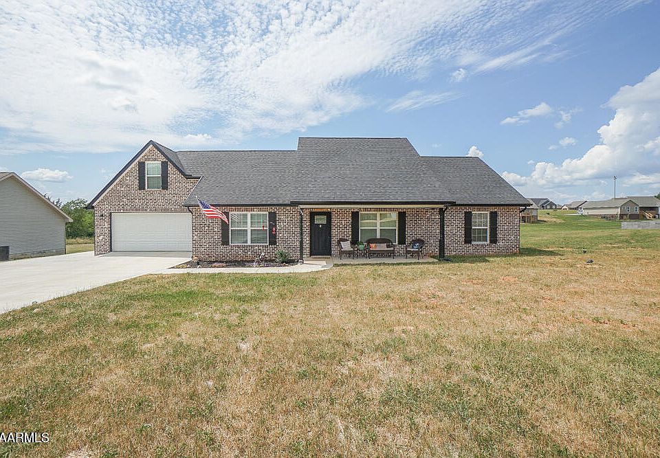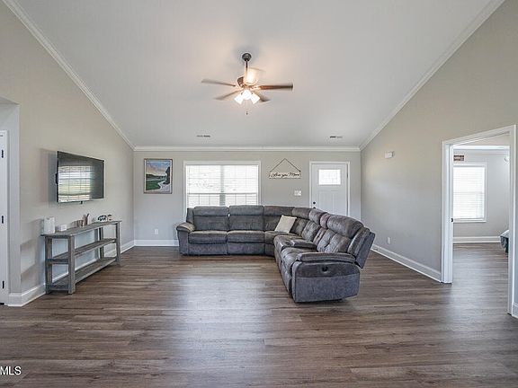 Practically BRAND NEW home (BUILT IN 2021!) in a lovely country setting. Open floor plan walks into the living space with vaulted ceilings; dining area and kitchen with large island and stainless farmhouse sink, backsplash, and pantry. Split bedroom floor plan! Owner's suite with trey ceilings and extensive crown molding throughout. En suite bath features a walk-in shower with subway tile from floor to ceiling, double vanity sinks, and large garden tub. Additional features include engineered hardwood flooring, bonus room above large garage, two-inch blinds throughout the home, tile in baths, a great covered porch and back deck that walks out to a large, flat backyard, and more. Two-car garage with epoxy floor and extra concrete pad on the driveway for additional space or RV parking.