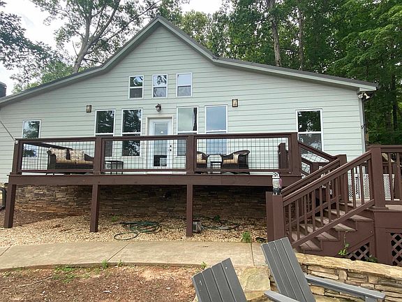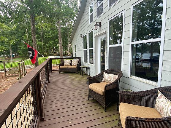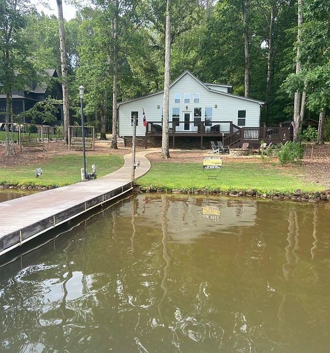 WOWZERS!! LOCATION! LOCATION! Water depth measured 11 FEET DEEP at the dock. Like new, 3 bedroom/2.5 bath waterfront home on a 2.4 acre lot with a private max dock, big water views from all the windows in the main living area. Home sits on a level lot and is just a few steps away from the water. This home was remodeled in 2017 to add granite countertops and luxury vinyl flooring. The vaulted ceiling, open floor plan, porches (covered and open) and workshop, make the 1,728 square feet seem so much bigger. Conveniently situated near the Landing Marina, you are just minutes away from shopping, restaurants, dry storage, and gas. This is a nice level lake lot at the mid lake area where the water is clear and deep and has a sandy beach type bottom. Furnishings are negotiable. Owner also has a ski boat for sale -2018 21 foot Chapparral with 2018 Yamaha 150HP for sale separately. Great turnkey opportunity for a vacation home with short term rental options.