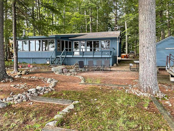 This is an original Frye Island cottage that sits close to the water's edge with panoramic views of the lake and Frye's Leap. Features 90' of beautiful sandy beach. This has a fixed platform dock with 4 dock extensions. The cottage consists of a large porch with a wood fireplace and an open dining room/living room. Both spaces have wall to wall double pane windows overlooking the lake. In addition it has 3 good sized bedrooms, 1 full bath and a galley kitchen. Outside has a large carport structure to park you cars and golf carts, also 2 sheds that house the golf cart and beach toys. Cottage is dated but has great ''bones'' that sits on a spectacular waterfront lot!