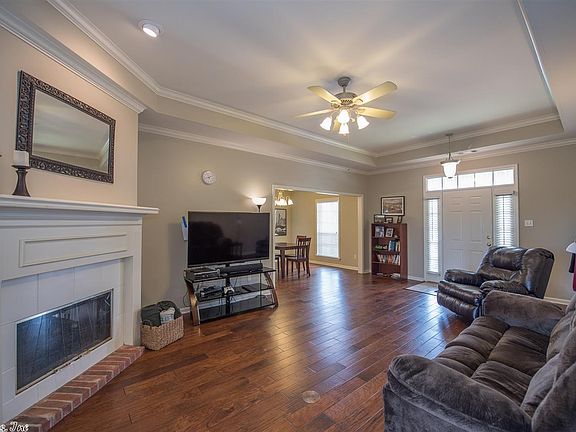 All this porch needs is a swing! This one level, all brick home has a versatile floor plan. Great room features a 10' tray ceiling w/crown molding, hand scraped wood floors, and a 2 sided fireplace which is shared with hearth room/breakfast room which is open to the kitchen. Lots of cabinets plus a pantry. Separate dining room. Large master BR, bath and closet. Owner uses 1 BR as office. Split BR plan. Covered patio in back with fenced ,terraced yard and shed. Garage has work counter incl. sink.Newer roof !