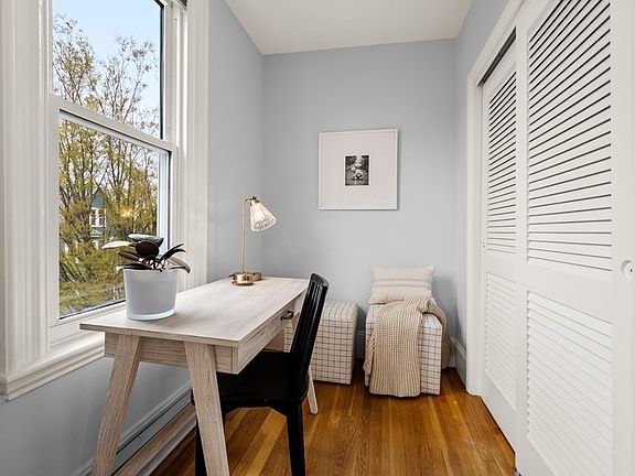 Sophisticated 2 bed ++ 2 bath situated on a corner lot in sought after Davis Sq. where you can enjoy all the restaurants, cafes, & shops Davis Sq. has to offer. (just 5 min walk to Davis Sq./Walk Score-93/Bike Score 96) This spacious condo lives like a townhouse w/ two levels of living. This SW facing sun-drenched unit features high ceilings, expansive eat-in kitchen, stainless steel appliances, freshly painted cabinets, in-unit laundry, private covered balcony, recessed lighting, pine hardwood flooring, formal dining room, living room w/ bay windows, office space, additional office space/study & is freshly painted throughout. Both levels of living have a full bathroom w/new fixtures, vanity & mirror. The top level has two large bedrooms & a bonus room that could be used as a second office/study. There is storage in the basement. Convenient to multiple GLX stops, Davis Sq Red Line, Somerville Community Path, Tufts, Harvard, MIT, Ball Square, Maguon Sq, & Teele Sq. See features sheet.