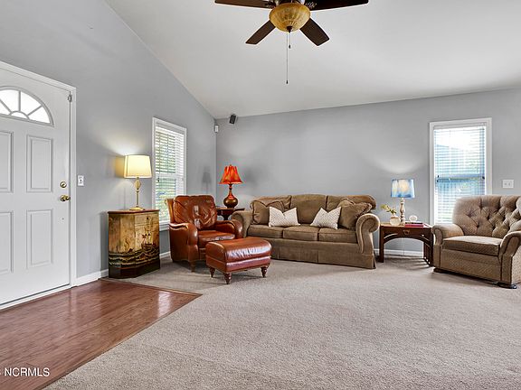 Perfectly located at the front of Belvedere Plantation, which is one of the staple subdivisions in Hampstead. This charming 3 bed/2bath home has an open floor plan, a great outdoor living area ''covered & screened-in'', as well as a large open space in the back that overlooks a Par 3 Green of Iron Clad Golf Course. The Primary Bedroom has a walk-in closet, and direct access to the relaxing back porch. The living room, kitchen, and dining boast vaulted ceilings allowing the natural light to flow throughout. Which creates the ideal entrance to a home. To further explain the perfect location: Shaka Taco, their new beer garden, Iron Clad Golf Course, and Belvedere Pickle Ball Courts are a short bike ride through the neighborhood streets. Add 5 more minutes to that ride, and you are strolling down South Belvedere overlooking the Intracoastal Waterway and Topsail Island. Kiwanis Park, Lowes Grocery Store, North Topsail Elementary, Topsail Middle & High School are all less than 2 miles away.