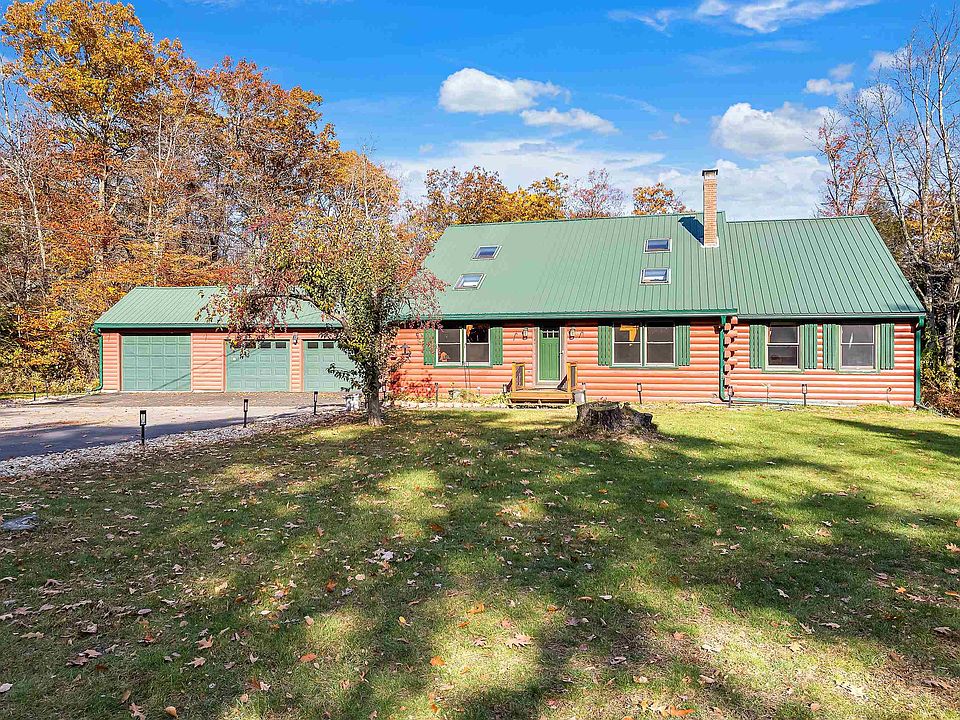 MOTIVATED SELLERS! Discover the essence of idyllic country living in this exquisite log home. Its rustic charm is accentuated by the warmth of natural wood and an abundance of sunlight. The kitchen is a masterpiece, featuring beautiful granite countertops, stainless steel appliances, and hickory cabinets. The first floor opens up with captivating cathedral ceilings, wood beams, and tongue-and-groove walls. An additional bonus room, adorned with cathedral ceilings and French doors, serves perfectly as a home office. The primary bedroom on the first floor offers ample closet space and direct access to a first-floor laundry, and a 3/4 bath.  A spacious screen porch overlooks the  mostly flat backyard which provides abundant light and complete privacy. This property includes a three-bay heated garage and extra storage at the back of the house, ensuring ample space for all your belongings.  Enjoy the convenience of a nearby fruit and vegetable farm within walking distance!   Open House 11/25/23 from 11am - 12:30pm.