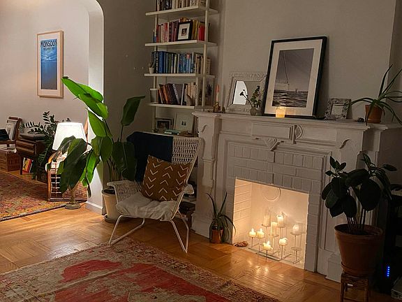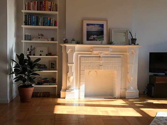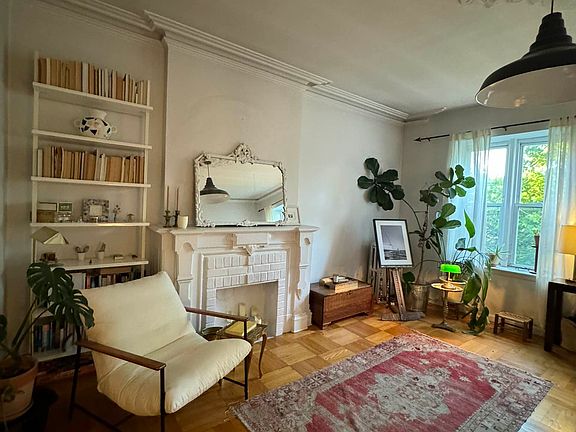 This spacious, sun-filled floor-through apartment-nearly 900 sq. ft.-sits on one of Greenpoint's most sought-after historic blocks. The expansive living room features three large south-facing windows, a decorative fireplace with its original mantel, and plenty of charm. A generous dining room (or library) offers flexible use, while the windowed eat-in kitchen provides ample storage and a dishwasher for convenience.