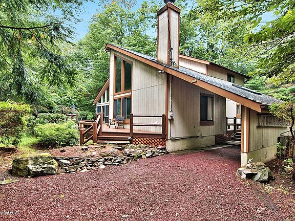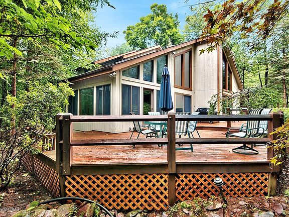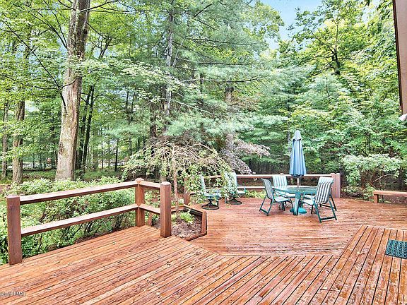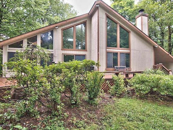 From top to bottom, this Timber Trails rustic contemporary has been lovingly maintained. Expansive windows with solar film allow the beautiful outdoors in. Stone wood-burning fireplace warms the open floored concept with tongue and groove ceilings and hardwood floors. Updated kitchen sports granite countertops and tile backsplash. Pocono room completed in 2010 provides additional living space. Spacious deck overlooks water feature (Sold ''as is'') and home backs up to State forest for additional privacy. Quiet cul de sac location and yet close to beach and Logan Steel Community Center. Don't snooze as this special home may be your perfect mountain retreat!