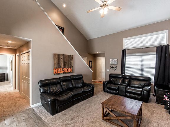 Nestled on a corner lot in a great family-friendly neighborhood, this striking 3 bed/2.5 bath home is sure to impress from the moment you drive up with a curb appeal of plush lawn & landscaping! Soaring ceiling, neutral paint, and natural light greet you upon walking into the open concept home that's ideal for entertaining. The bright & airy living room features a gas fireplace and opens directly into the spacious kitchen & dining area. A highlight of the kitchen is the gorgeous, unique tile flooring. Enjoy natural light & ample closet space in each of the roomy bedrooms. Step outside to the immense, fenced backyard that's perfect for entertaining with expansive patio and in-ground storm shelter. Don't miss out on making this gorgeous, move-in ready home your own today!