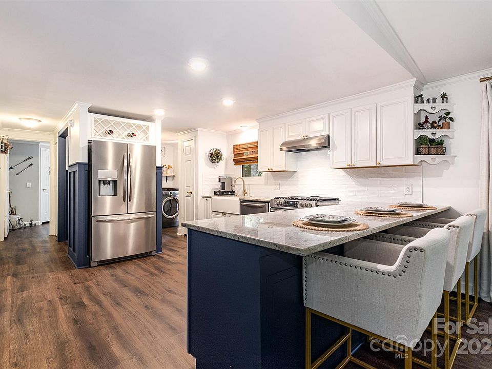 Tucked away on 1.05 wooded acres, this home offers the perfect blend of privacy, style, and comfort. The wooded setting creates a peaceful retreat-like atmosphere, yet you’re still within easy reach of Mooresville and Troutman conveniences. Inside, thoughtful details and major improvements shine throughout. Durable luxury vinyl plank flooring, added in 2020, flows seamlessly across the home, complemented by arched entryways that add elegance and charm. The remodeled kitchen (2020) is a true showstopper with abundant cabinet space, granite countertops, a textured ceramic tile backsplash, built-in wine rack, farmhouse sink, peninsula with seating, and stainless steel appliances. The primary suite feels like a spa getaway, with a sliding barn door entrance, dual vanities, elegant wainscoting, and a glass-enclosed low threshold shower with marble-look walls. Both baths were remodeled in 2025, blending modern style with timeless finishes. Designed with accessibility in mind, the home includes a ramped entry along with a spacious kitchen and primary bath, offering ease of movement making it wheelchair-friendly. The living room centers around a cozy fireplace—perfect for quiet evenings at home. Step outside to enjoy the expansive back deck, partially covered so you can relax or entertain in every season. Updated windows (2020) and a brand-new heat pump/AC (2025) provide year-round comfort and efficiency. Much of the cedar siding was replaced in 2022, and the roof was replaced in 2015, offering long-term peace of mind. A convenient shed at the rear of the property adds bonus storage, and with the refrigerator, washer, and dryer included, you can move right in. Come for the privacy, stay for the style—this hidden gem combines a nature retreat vibe with modern updates throughout.